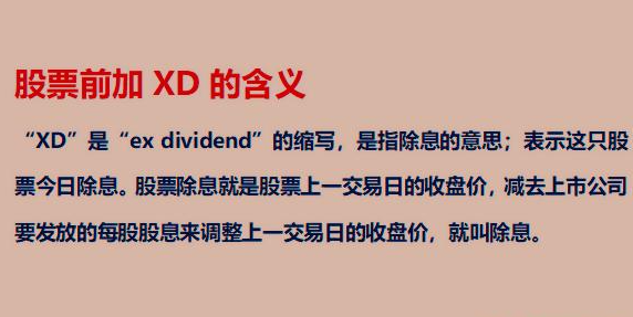 当股票名称前出现XD字样时,表示当日是这只股票的除息日,XD是英语Exclud(除去)Dividend(利息)的简写。在除息日的当天,股价的基准价比前一个交易日的收盘价要低,因为从中扣除了利息这一部分的差价。