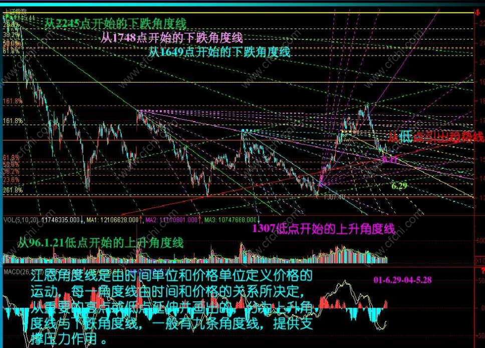 在江恩价位中,50%、63%、100%最为重要,它们分别与几何角度45°、63°和90°相对应,这些价位通常用来确定建立50%回调带。