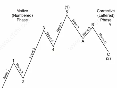 跟道氏理论一样,波浪理论的本质都在于研究市场结构性运动及其自然规律。因而,运动形态是波浪理论最重要的部分。这里的形态是指波浪的形状及结构,当初艾略特就是根据价格走势形态创立了波浪理论。根据该理论,在市场中价格运动与发展基本采取的是标准8浪结构形态。8浪结构由5个上升浪和3个下跌浪(下图A、B和C)组成,而5个上升浪又包含3个推动浪(下图1、3、5)和2个调整浪。