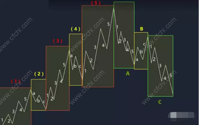 这个还只是标准的结构。波浪还可以再细分,理论上既可以把波浪组合成更长的波浪,也可以把波浪细分成更短的波浪,如下图所示,浪中有浪,大浪含小浪,小浪再套小浪。波浪区间统计涉及两个因子:时间与空间。而波浪理论最大争议在于,这两个因子无论是在整段行情走完之前,抑或行情走完之后,都是无法标准定义的,大多数情况投资者只能意会揣测。这也是波浪理论的一个最大缺陷。