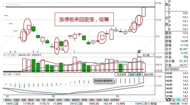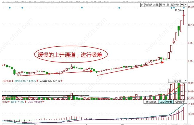 这种吸筹方式多见于底部。由于某些原因,比如在底部拿不到足够的筹码,主力会利用拉升股价进行吸筹,从而将股价推到涨停板。一般情况下,主力会利用破板走势,吸引散户抛出手中筹码。