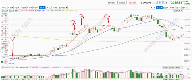 比如2440-3288这一波日线图中,低位的1号上影线是在试盘和洗盘,看看拉升时有多少抛盘,如果抛盘重,那就继续横盘洗,如果抛盘不重,那就开始拉升。而上涨途中的2号、3号、4号K线,这里就是在出货了,到了相对高位,把前面大量的获利盘兑现。因为前面一波快速的拉升,吸引大量交易者进入,刚好做这一波拉升的接盘者。