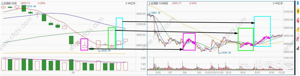 上涨趋势是一个相对高点和低点都不断创抬高的过程,一根大级别的K线,其实就是次级别上的一段趋势,如下图所示,三根带上影线的日K线放在5分钟上就一段走势结构,我们可以利用这一点来理解上影线。