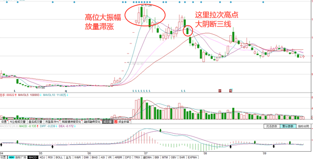 5、当短线下穿中线,且短线与长线正乖离率太大时,形成短线最佳卖点交叉形态。