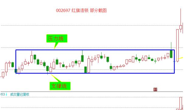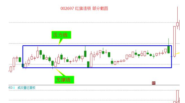 红旗连锁在经历了前期上涨行情后,开始了我们看到的箱体整理形态,股价在这个区间内来回震荡,持续了一个多月。在此期间成交量也一直维持在一个基本水平甚至逐渐缩小的区间。箱体震荡只是是暂时性的,后期的突破也是必然的。如上图,我们看到在震荡了一个多月后成交量迅速放大,突破箱体继续向上运行。而上涨的幅度大致和箱体的高度相同。对于此类形态股市“小白”和入场不久的人建议保持观望,而对于股市老手则可参与这种区间波段,做好高抛低吸。而此类形态的一般入场点是向上突破回调至上边界时可部分参与。我们再来看个下降趋势中的箱体形态,如下图: