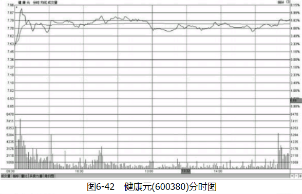 由于高位横盘形态,属于一种看多后市的强势形态,所以,该形态若出现在行情上涨过程中,或已经确定的底部区域,实战意义是最大的;如果出现在长期下跌走势中,则意义不大。从图6-41 ~图6-44中可以看到,上面的个股在开盘不久后, 均出现了快速上涨的走势形态,并且成交量也出现了明显放大,说明市场中的主动买盘比较踊跃。但之后,我们看到,行情出现了微妙的变化,股价均出现了回落走势,呈现冲高回落的姿态,但好在股价依然处于高位运行,并没有出现明显的下跌,高位横盘特征非常明显;