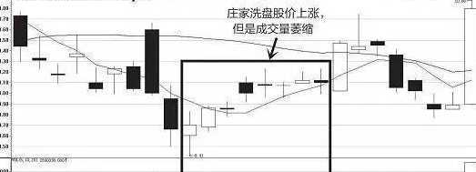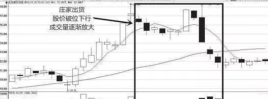 如上图,就是一个完整的庄家操盘形态,图中标注的两个点位就是洗盘与出货的状态,从对应的成交量可以看出:庄家洗盘时,成交量是缩量,随着股价下行,成交量也是逐渐递减的,一直处于一种萎缩的成交量,因为庄家又要握住手中的筹码而不敢放量,K线上也未跌破有效价位。而第二个标注位伴随着股价的下跌,成交量明显放大,因为此时,庄家已经达到目的,开始高位抛盘,成交量瞬间放大,且随着股价的下跌,成交量也一直保持在高位,并不会萎缩。