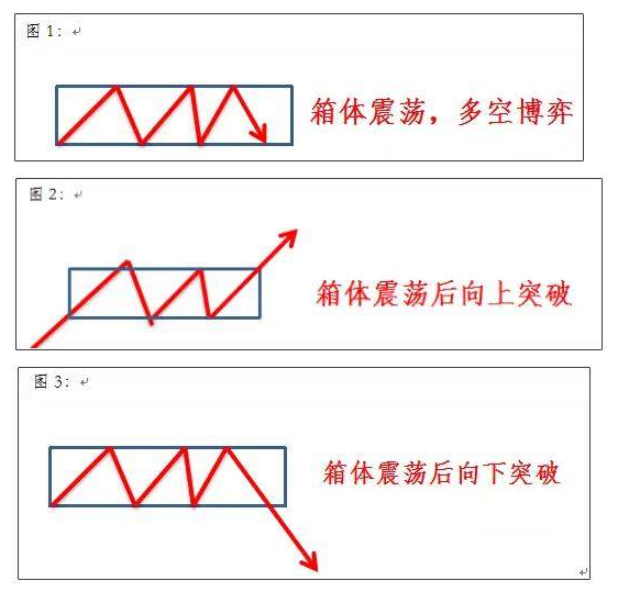 平,即箱体震荡;涨,即箱体突破;跌,即箱体破位。如下图1、2、3: