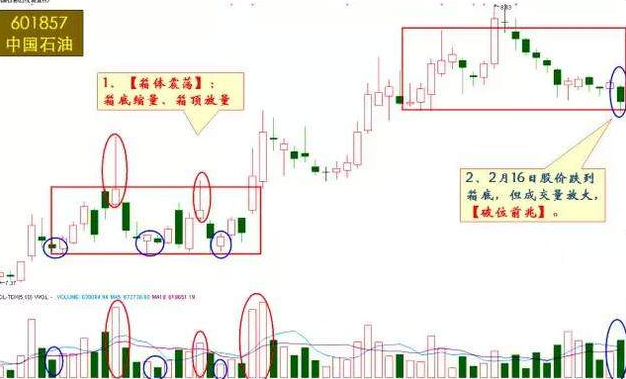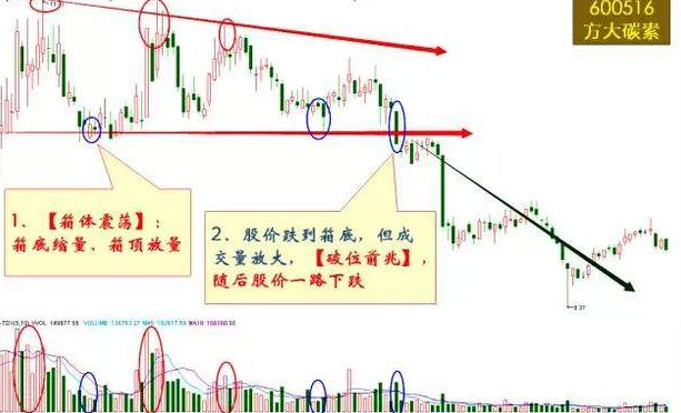 (2)【破位前兆】特征是股价跌到箱底时成交量放大,预示股价会继续下跌,形成【箱体破位】;