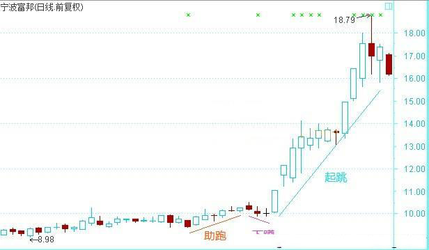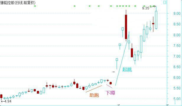 这种形态可以比喻为助跑起跳,股价先有数日助跑,然后一个下蹲动作,之后起跳。其在主升浪形态中最常见,力度也较强。