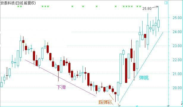 这种形态可以比喻为踩弹簧,股价缓慢滑下一个有弹簧的坑中,之后踩到弹簧弹跳而起。这种形态还有一个特点,就是上攻初段力度非常强,其后逐步衰弱,可能转跌或需要高位中继重新开始新攻势。