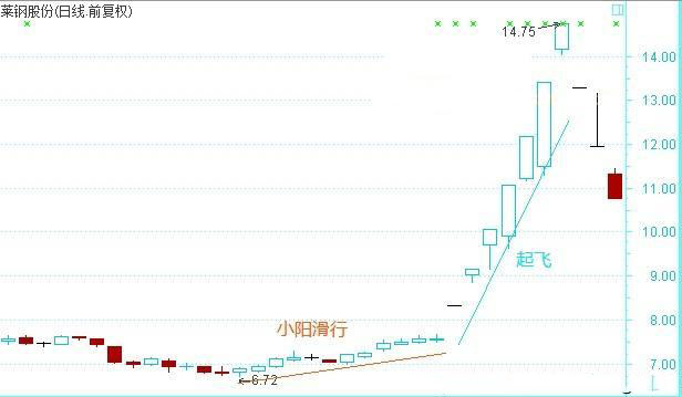 一、缓慢上行后加速形态。这种形态要求连续8个交易日以上缓慢上行,大部分交易日或全部交易日收小阳,中间收阴的交易日不超过四分之一。此种形态反映的内在因素为主力缓慢吸货并推高股价,为主升浪积攒能量。