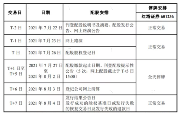 7月22日,红塔证券发布配股说明书,称本次配股以股权登记日2021年7月26日(T日)上交所收市后红塔证券A股股本总数36.33亿股为基数,按每10股配售3股的比例向全体A股股东配售,可配售股份总额为10.90亿股。配售代码为“760236”,配售简称为“红塔配股”,配股价格:7.33元/股。