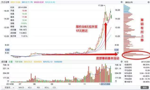 如图所示,为方正证券前期的吸筹工作,时长近一年半,筹码集中收集区域在6元左右。这个区域,也就是主力吸筹的大体成本。