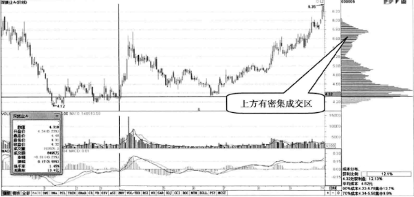 从筹码分布指标来看,当股价在第一个平台横盘整理后,虽然在当前平台形成了一个密集成交区,不过在平台上方还会存在一定的密集成交区。这说明仍然有高位购入股票的投资者不愿卖出股票,继续持有,他们持有的筹码会对未来股价上涨形成较大压力。