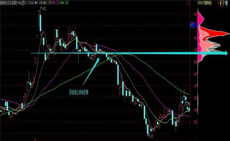 上涨行情的充分条件是股价的上方没有大量的套牢盘,下跌多峰中的每一个上峰都是强阻力位,上峰消失,在低位形成新的单峰密集意味着止跌企稳。
