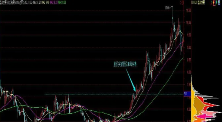 股价经低位单峰密集后启动上涨行情,在拉升途中做震荡整理形成了两个或两个以上密集峰,新密集峰形成时原密集峰虽减小,但仍存在。