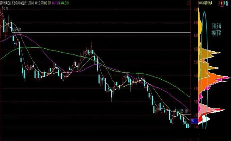 股价经高位单峰密集后启动下跌行情,在下跌途中做震荡整理形成了两个或两个以上密集峰,新密集峰形成时原密集峰虽减小,但仍存在。
