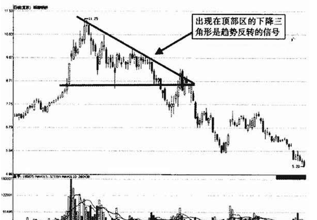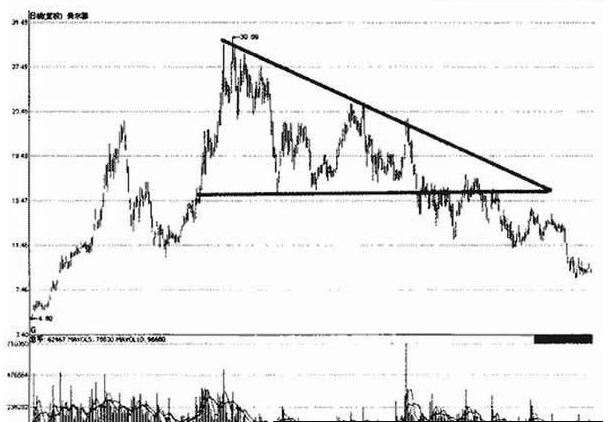 下降三角形形态的出现,说明在三角形区域内的较量中,卖盘占据了主动地位,这体现在股价反弹时创出的高点一次比一次低之上,由于市场中仍有不少抄底盘存在,故买方在其特定的股价水平上不断买入,因此形成水平方向的支撑线;但由于前期大势走熊,买方并不急于买进,于是股价回升力度一次比一次弱,卖方不待股价回升到上次的高点,便急不可耐地卖出,因此形成一条向右下方倾斜的阻力线。