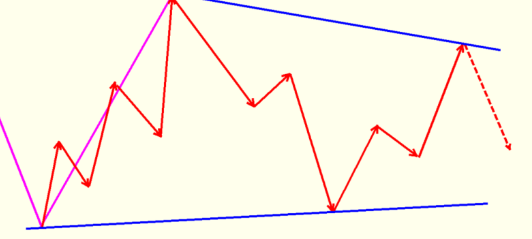 当前面两个反弹顶部已经形成了下倾的上部边界线时,从下部边界线出发的第三个反弹上升并以一适度的幅度冲过最初顶部线,这个运动没有形成可识别的突破性交易量,在没有超过前一形态顶部最高点时停了下来。当价格随后又回至形态中时,必须将原来上部边界线废弃,再由第一次和第三次反弹顶部重新画一条线。