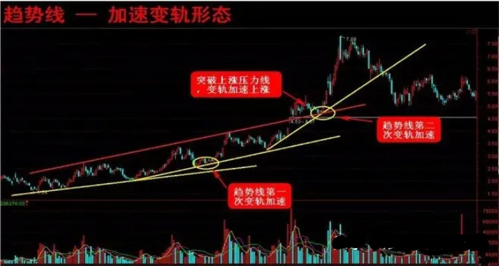 ⑵上升过程中,当上升趋势线改变轨道、角度抬升,则意味着股价加速上涨。