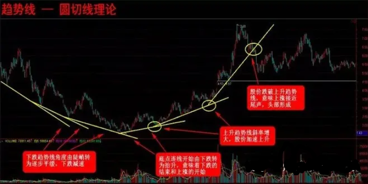 圆切线形态是指在股价整个涨跌运行的周期中,所有的底点连线可近似的看作是股价涨跌所形成的“圆形轨迹”的切线。通过这些切线方向的变化,不但可以提前判断股价顶底,而且可以及时发现股价涨跌的速率,在实战操盘中具有重要的指导意义。