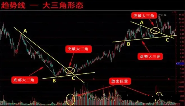 大三角形态是指一条高点连线的压力线、一条低点连线的支撑线、这两条趋势线所经过的最高点和最低点的连线所组成的大三角形形态。在实际应用中,股价沿着支撑线向上运行,当股价放量突破大三角的上轨压力线时,往往意味着一波上涨行情的开始,是较好的买入点位。按大三角形态出现的位置,可以分为底部形成的大三角和上涨过程的整理大三角,底部大三角往往在一波上涨行情的初期,后期上涨空间较大;整理大三角往往是上涨一波后的整理蓄势,未来上涨空间不大。