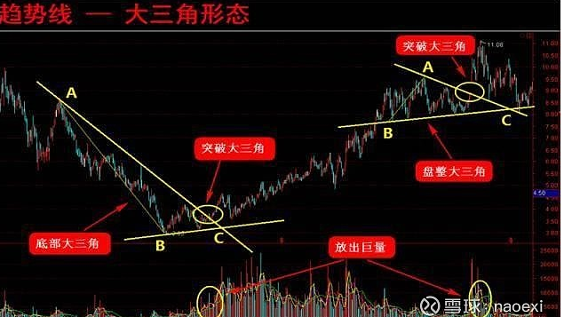 按大三角形态出现的位置,可以分为底部形成的大三角和上涨过程的整理大三角,底部大三角往往在一波上涨行情的初期,后期上涨空间较大;整理大三角往往是上涨一波后的整理蓄势,未来上涨空间不大。