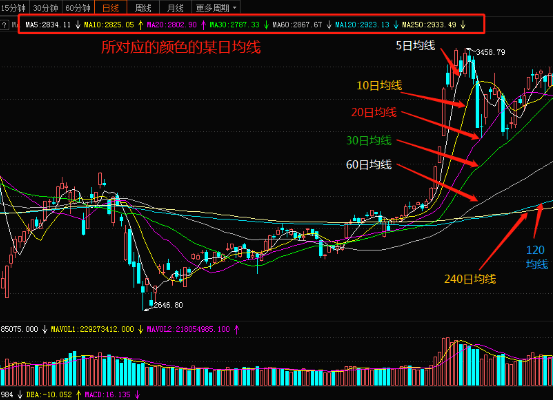 不同的参数给均线做依据,其作用和反应情况是有差别的。常用的参数有5日、10日、20日、30日、60日、120日、250日。常用的颜色有白色(5日线)、黄色(10日线)、紫色(20日线)、绿色(30日线)、灰色(60日线)、蓝色(120日线)、橙色(250日),颜色并不是一一对应的,股民是可以任意设置颜色,只要自己喜欢即可。