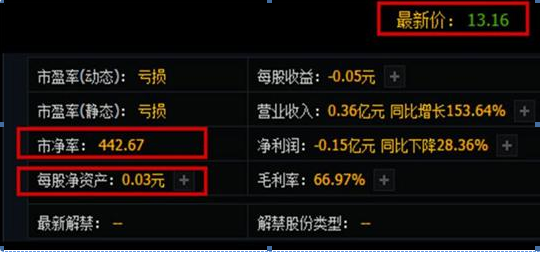 如图所示:该公司每股的价值只有0.03元,但是你每股却要花13元左右去购买,高于价值400多倍。