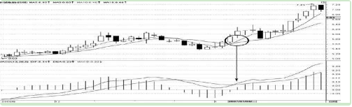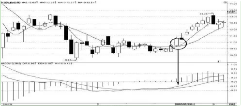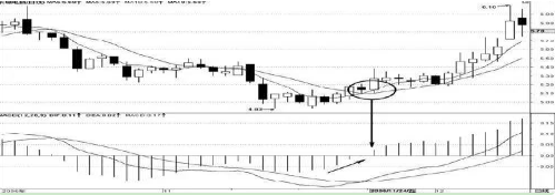 3)5日线和10日线发生金叉的当日或次日,MACD住状态能量从0轴之上之下的空头空间向0轴之上的多头空间延伸,绿色住状态逐步萎缩消失并转化为红色住状线,均线交易信号强烈有效;也就是在均线金叉形成的同时,MACD开始红肥绿瘦,或者出现明显的零点,也可看成是一个转折点。