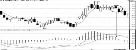 7)5日线拐头向下的当日或次日,MACD住状能量线从0轴之上的多头空间向0轴之下的空头空间延伸,红色住状态逐步萎缩消失.并转化为绿色住状线,此时应短线卖出。均线交易信号强烈有效。和上述判断一致,且信号更为明显,已经开始穿零轴。