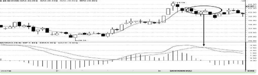 6)5日线走平的当日或次日,MACD住状能量线从0轴之上的多头空间向0轴之下的空头空间延伸,红色住状态逐步萎缩但未消失.尚未转化为绿色住状线,此时应短线卖出。均线交易信号强烈有效。也就是MACD开始形成红瘦绿肥,且已经形成了死叉,可以减仓。