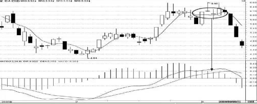 4)5日线走平的当日或次日,DIF和DEA线在0轴之上的多头空间形成死叉,此时应短线卖出,均线交易信号强烈有效。死叉的应用,也叫双死叉效应。