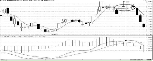 5)5日线和10日线发生死叉的当日或次日,DIF和DEA线在0轴之上多头空间形成死叉,此时应中线卖出,均线交易信号强烈,与上述一致,通过MACD死叉形成,判断行情。