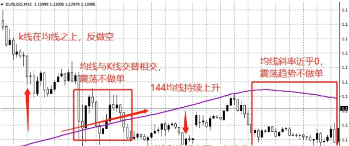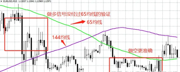 但144均线系统也存在判断不准确的时候,如下 EUR/USD 15M图,用144均线判断市场趋势,明显可以看出,当均线上升,市场价格位于均线之上时,短期市场价格是下跌的。只能说长期来看可以做多。简单的原理用来看看趋势就可以了,判断进场点还要更谨慎。