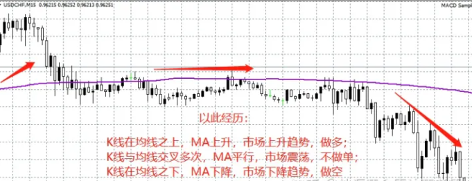 如下 USD/CHF 15M图,左边是上升趋势,价格短时回落后,144MA与K线交叉,持续较长时间后,来到右边的下降趋势。