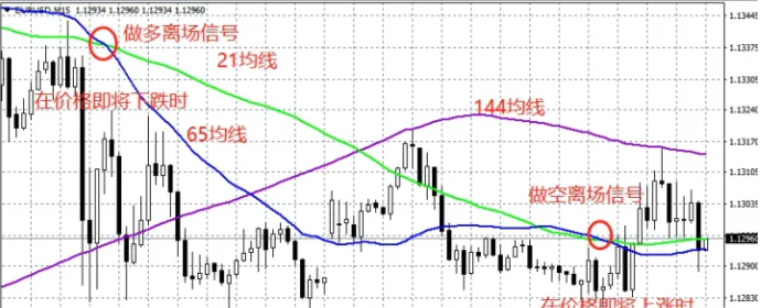 65均线和21均线结合,可以更准确的判断出场信号。当21均线向下突破65均线时,为出场信号。但当144均线进场后,21均线下穿65均线,不是离场信号,此时可以先减仓,待144均线验证跌破,出场。