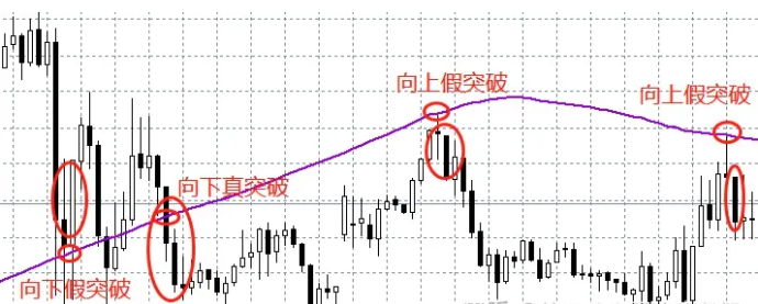 在均线的突破中,也存在虚假突破。一般认为,当价格向下突破均线时,有大阴烛出现为有效突破,价格向上突破均线时,有大阳烛出现为有效突破。