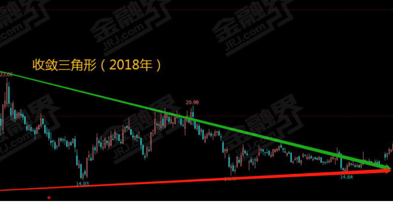 收敛三角形它的特点就在于:一个高点比一个高点低,一个低点比一个低点高,这是一个典型的特征。