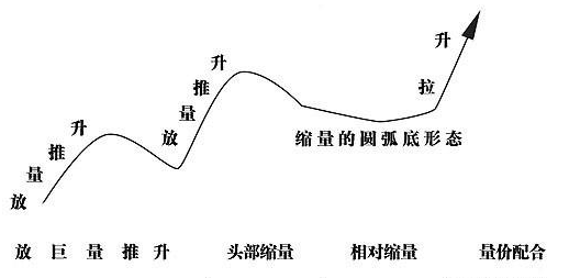 5、放量震荡推升,形成两个圆弧顶部形态,缩量做底后拉升