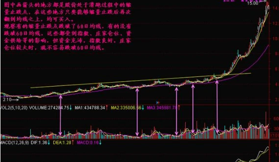 所以,当股价跌到60日平均线附近时,可以观察其成交量是否极其萎缩,股价能否在这里翘头向上,并发生金叉,如果是的话,这里是较好的买入点。