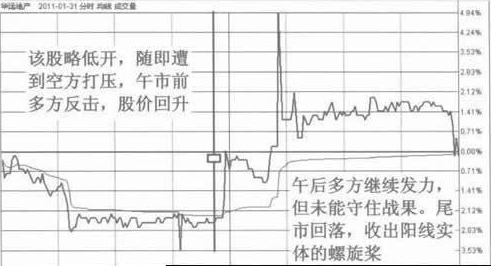 收出螺旋桨之前,股价一直上涨。收出螺旋桨的当日,多方感到了压力,场外的交易者则各有不同,一部分踏空很久而追随多方入场抢进,所以螺旋桨当日股价被大幅推高。另一部分交易者则感到困惑,犹豫不决,迟迟不愿进场,导致多方后续力量不足。此时空方乘机打压,股价最终回落,形成螺旋桨的长上影线。