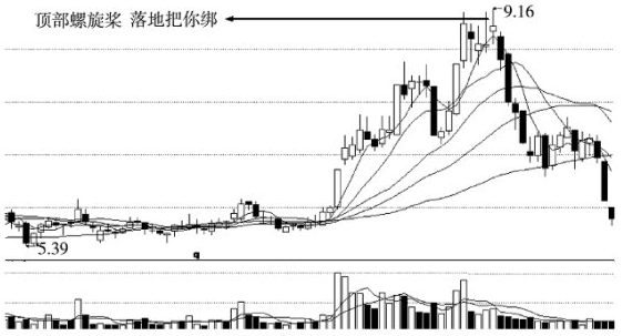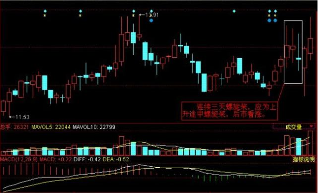 5、底部螺旋桨的出现,一定要有复合见底K线形态语言的出现,如后续有成交量的放大及双底配合,买入成功概率大。