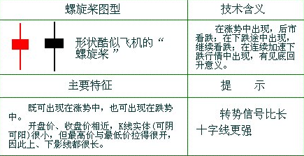 螺旋桨K线实战技术螺旋桨是腾飞上升的动力,在股票市场中它就是启动的象征和从跌势转向涨势的一个重要信号。在一些股票经过长期下跌,在其跌势的末端,有时你会惊奇地发现有一种‘螺旋桨形态’出现,它是一个带着非常长的下影线的K线,也是通常所说的“单针探底”。这种形态,是一个在跌势中难得的获大利机会,只要它一出现,此后就有机会获得30—45%利润。