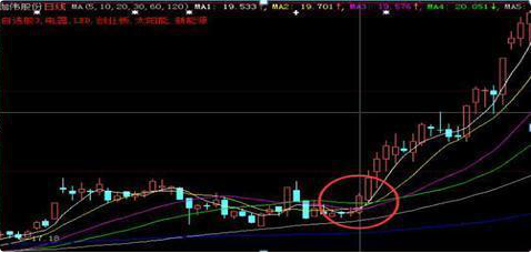 也就是说,当出水芙蓉发生的一瞬间,我们也可以认定位是庄家公开的,肆无忌惮的、大量的、明显的建仓行为和拉升行为的先兆,在这个点出现后买进,第二天还有可能跌破均线,也是个买入机会;如果第三天也没有买进,那么就要等它上升以后回档,回档不破均线,就可以坚决买进,这是第二次机会。