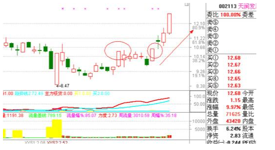 在实际的操作中,连续大阳线拉升的股票一般是很少见的,这种股票也比较难抓住,但是大多数股票在大阳线后会出现连续几天的调整,很多散户在回调的时候是不敢贸然下手的,因为大家都害怕是不是庄家在出货,但是如果一只股票在调整过后又出现大阳线,这时就可以说明庄家不是在出货而是在洗盘,后市会大概率上涨,这种K线的形态我们就叫双响炮。