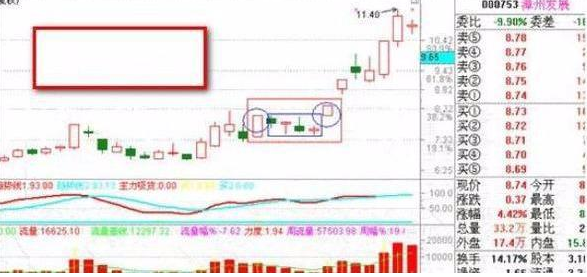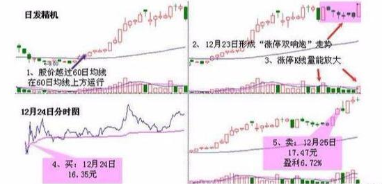 或者前炮大阳线+后炮涨停板。这里所指的大阳线是涨幅超过5%,涨幅越大就越好,另外ST股不算在内