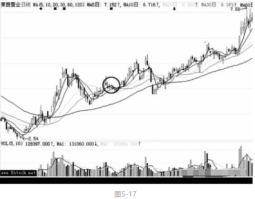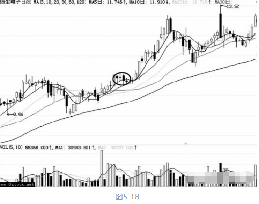 如图5-18所示,恒生电子(600570)在上涨的途中连收数根小阴线,股价在一个狭小的空间内整理,洗盘结束后,以两根长阳快速突破整理平台,展开新的攻势,随后的涨幅喜人。可见自古英雄多磨难,自“股”黑马多阴线。