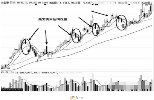 如图5-3所示,ST金泰(600385)在洗盘时频繁地使用接近跌停价位的大阴线洗盘,造成恐慌的效果。